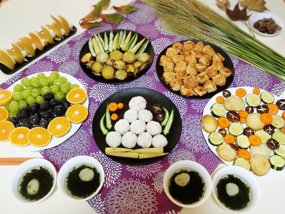 お月見メニューは、まんまるお月様をイメージして、丸い食べ物をならべてみました!