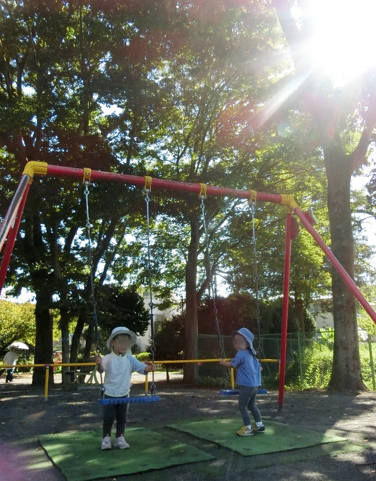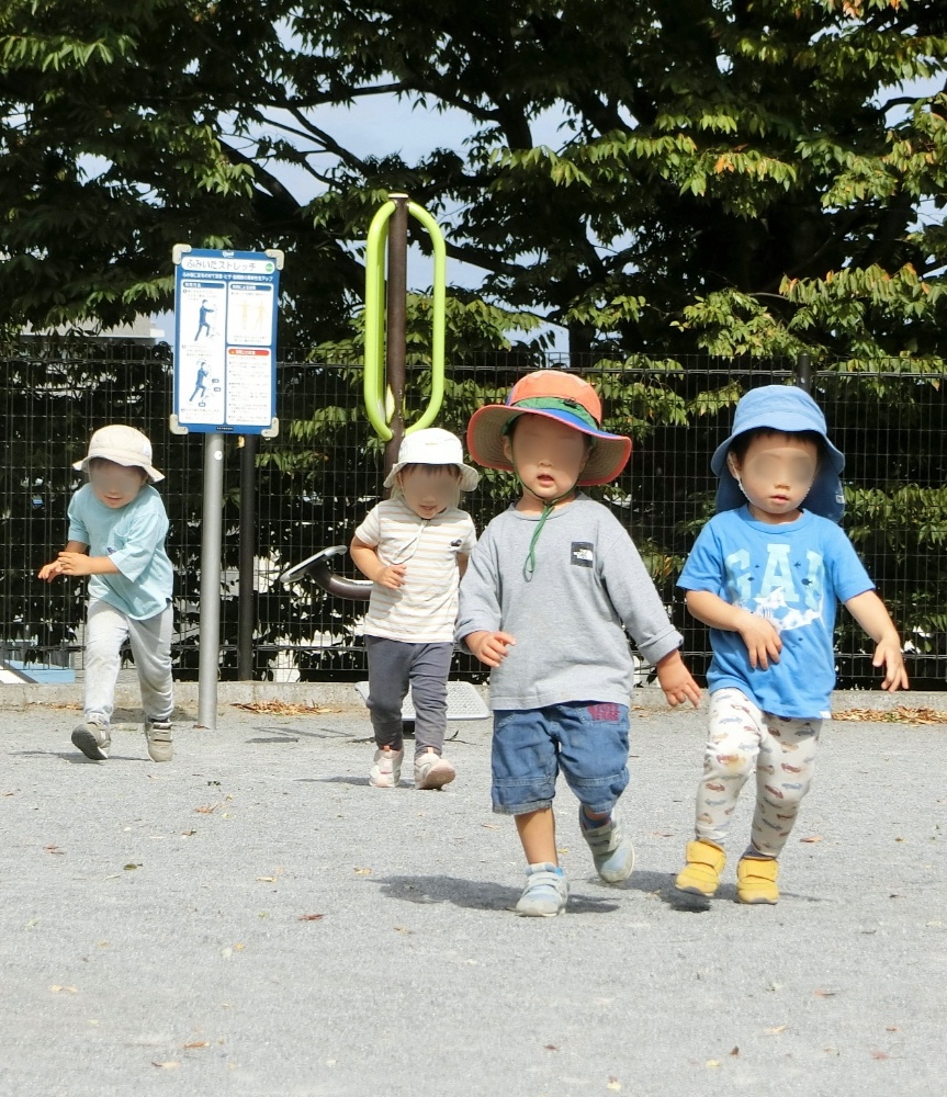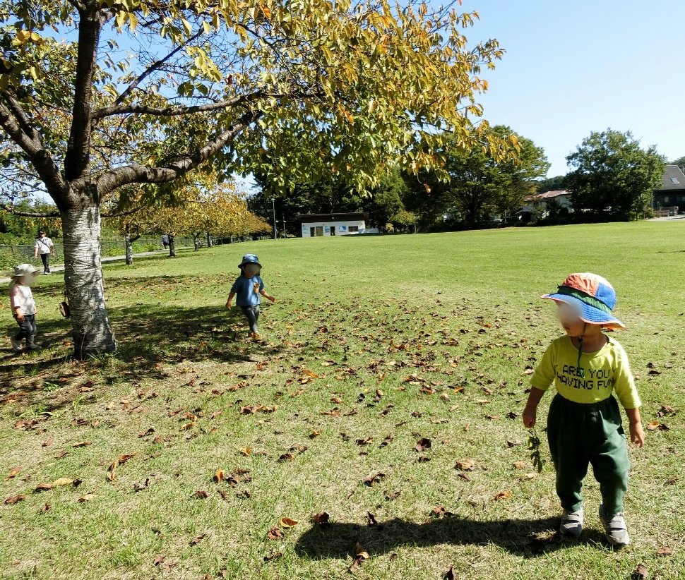 公園での散歩では、落ち葉や枝を拾いつつ、時々見つける色んな実を「これ、な〜に?」「ねぇ、見てー!」とみんなで覗き込んで観察し、ポッケに入れて持って帰っています。