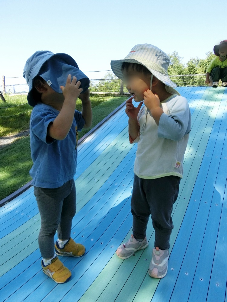 (帽子の後ろの日除けが前に回ってしまった事がおかしい2人)