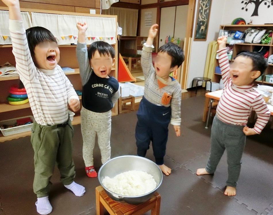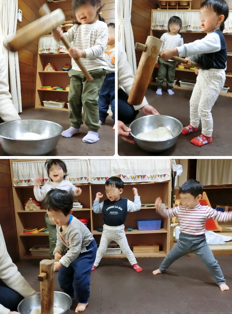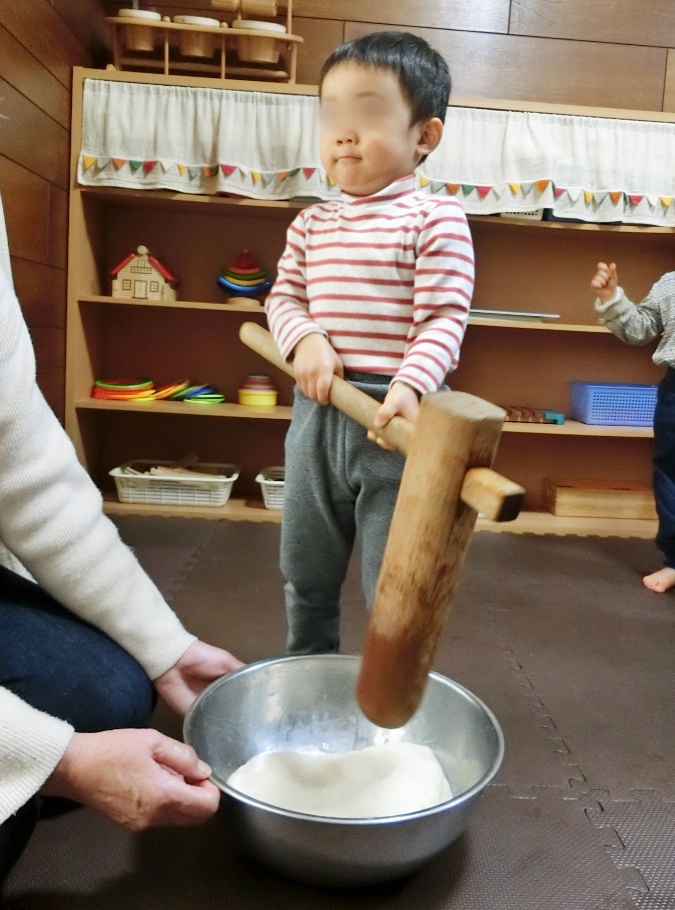 水曜日、餅つき会に参加できなかった子の為、餅つきをしました。「子どもだけで頑張らなくちゃ!」と気合が入っています。