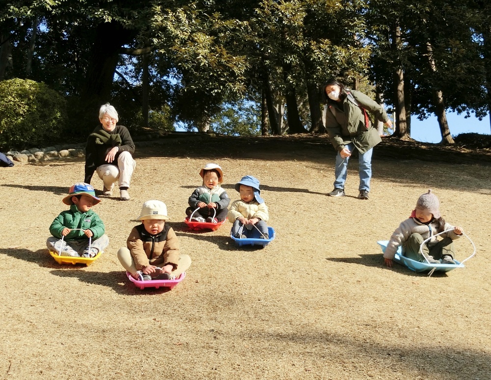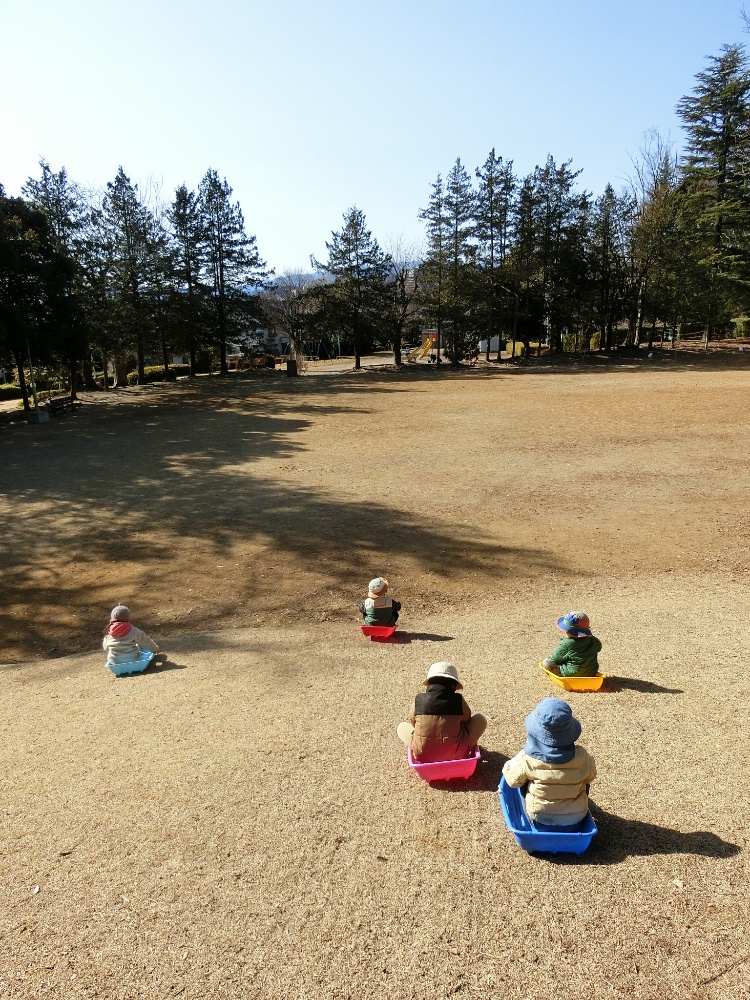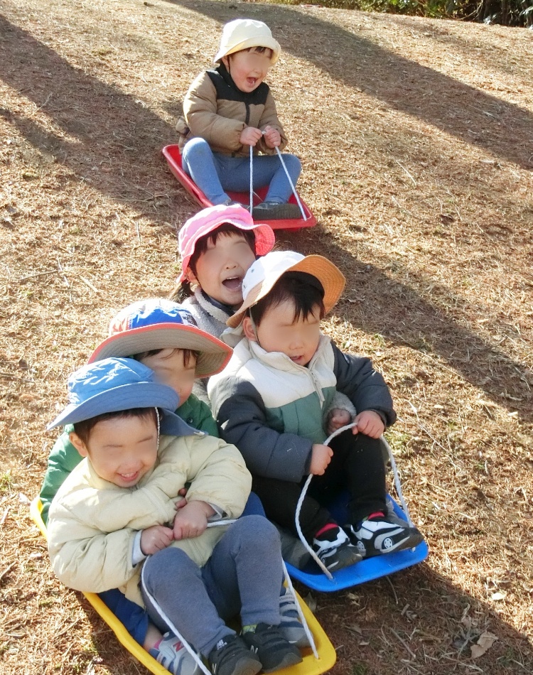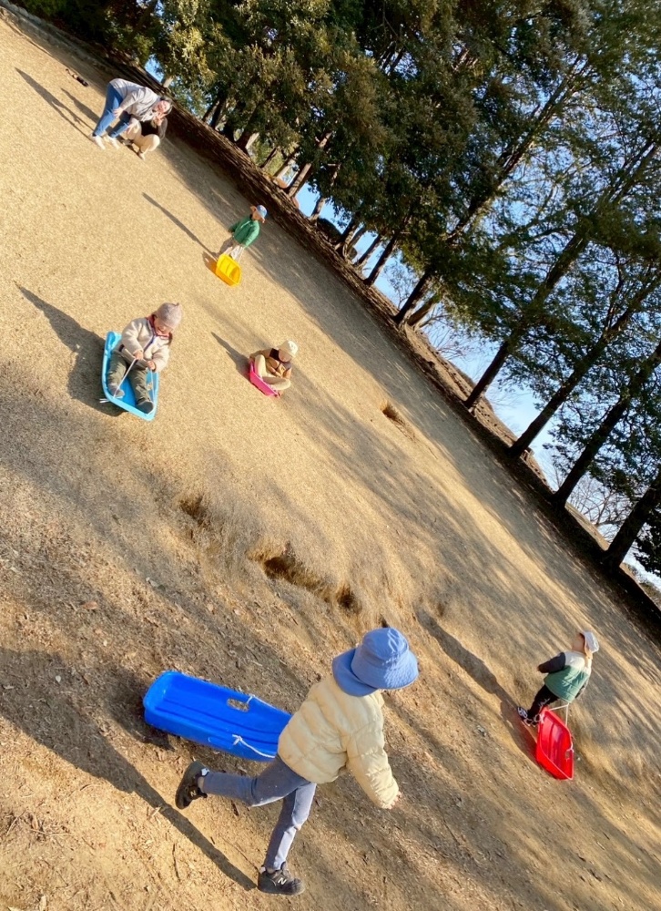 傾斜の急な斜面で、スピードが出ても、転がって落ちてしまっても、楽しい気持ちが勝って、繰り返しすべり続ける5人。子ども自身が、そりを持って自力で登ってくるだけでも息が上がる良い運動でした。