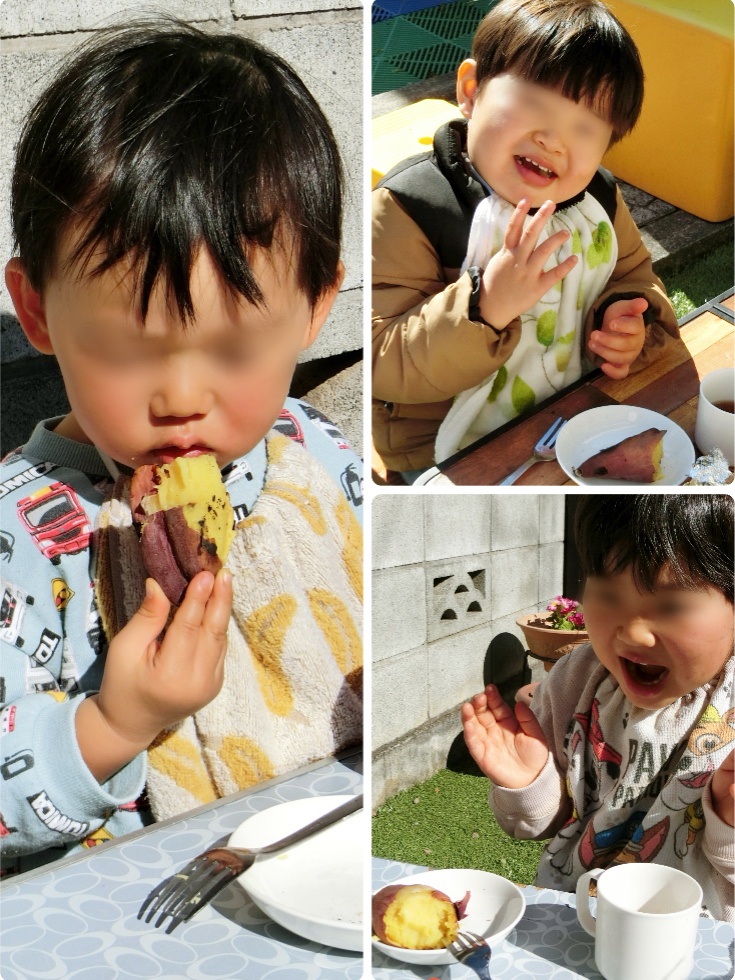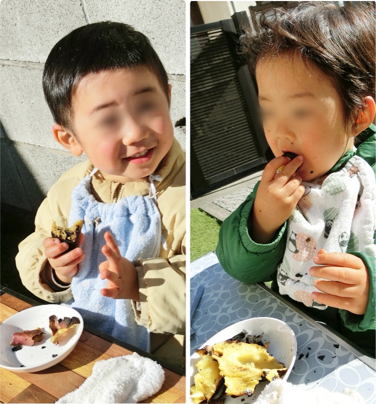 そして「焼き芋したい」「今度はお餅を焼きたい」と楽しみにしていたので、お庭で炭火ランチも楽しみました。日の当たる場所は、汗をかくほど暖かく、ほっぺを真っ赤にして、湯気の出ている焼き芋を堪能していました。